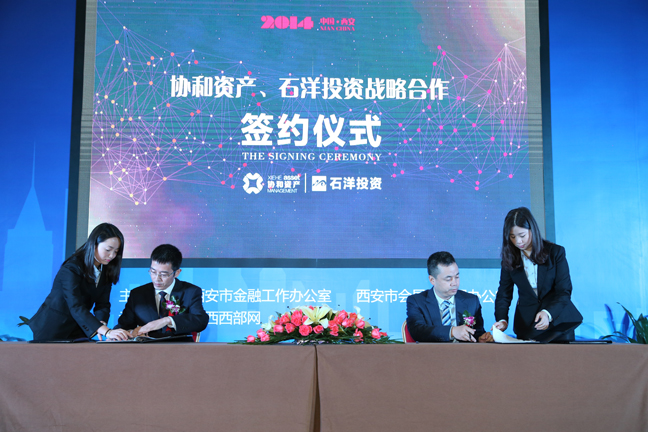 10月12日,陜西石洋投資管理有限公司(石洋投資)與陜西協(xié)和資產(chǎn)管理有限公司(協(xié)和資產(chǎn))戰(zhàn)略合作簽約儀式在“2014中國•西安金融產(chǎn)業(yè)博覽會”主會場曲江國際會展中心隆重舉行。石羊集團董事長魏存成、協(xié)和控股董事長成建禮出席并見證簽約儀式,雙方其他領(lǐng)導(dǎo)和嘉賓共同參加了會議。